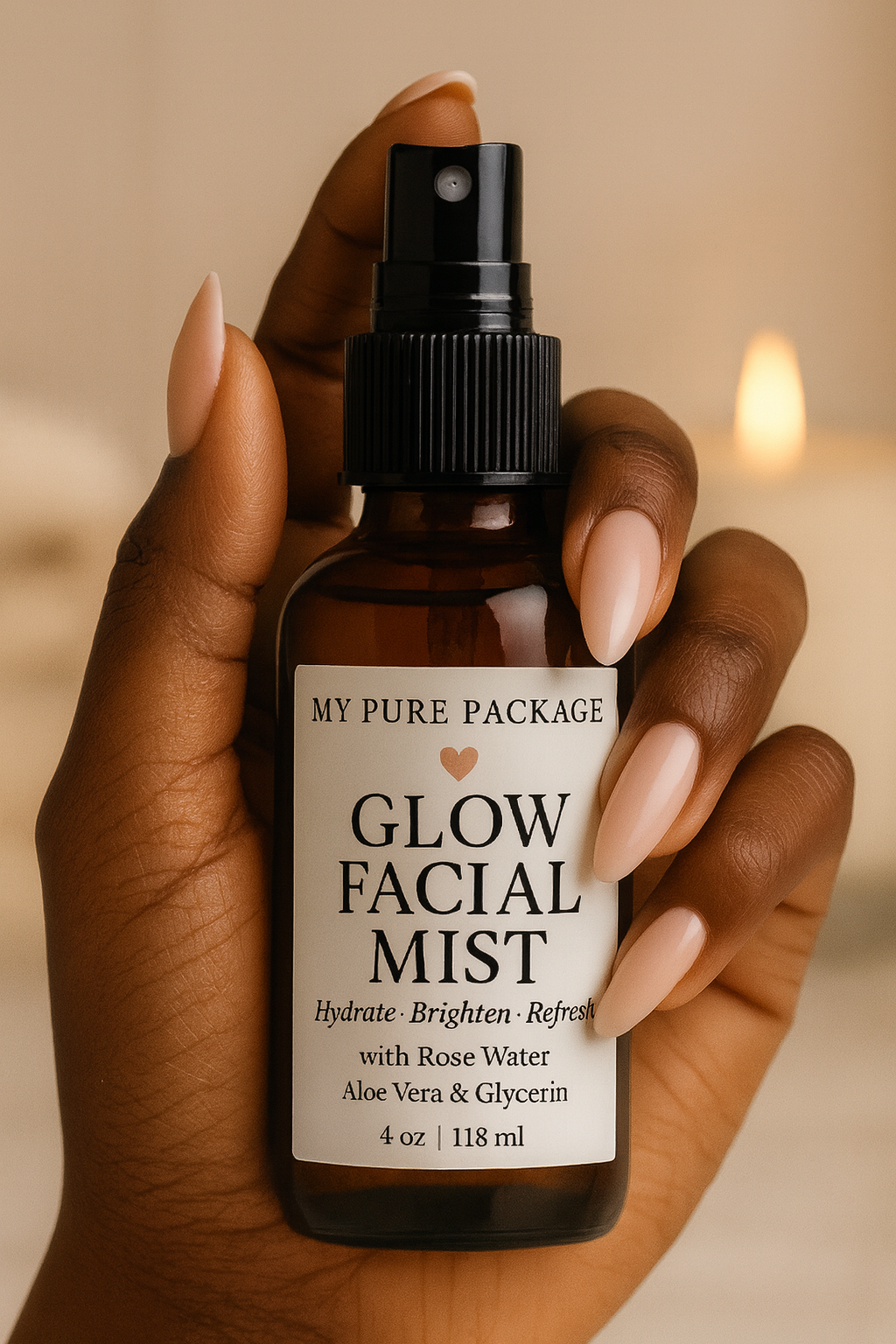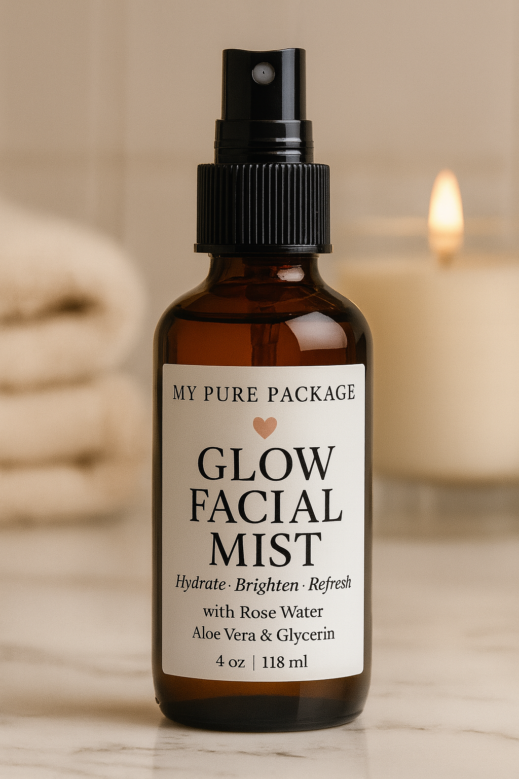 Introducing the Glow Facial Mist by My Pure Package – your go-to ritual for radiant, hydrated skin. Infused with rose water, aloe vera, and glycerin, this luxe mist hydrates, brightens, and refreshes your face in seconds. Perfect for your morning routine, midday pick-me-up, or a calming wind-down moment.
